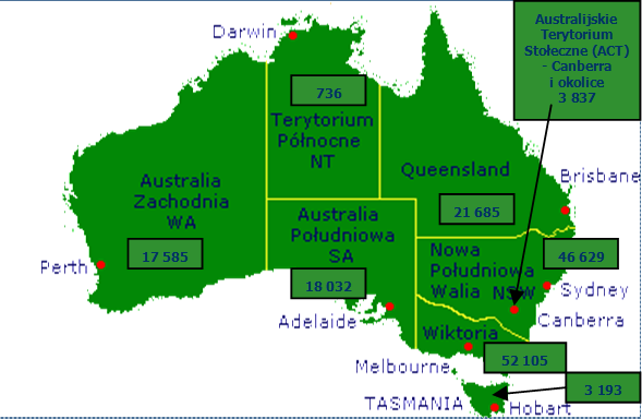 Biorąc pod uwagę kryterium pochodzenia, według danych ze spisu z 2006 r. największym skupiskiem Polonii w Australii jest stan Wiktoria (52,1 tys. osób); na drugim miejscu znajduje się Nowa Południowa Walia (46,6 tys.), potem Queensland (21,6 tys.), Australia Płd. (18 tys.) i Australia Zach. (17,5 tys.). Kryteria urodzenia w Polsce i języka używanego w domu potwierdzają największą liczebność Polonii w stanie Wiktoria i nieco mniejszą - w Nowej Południowej Walii, na kolejnych miejscach sytuując jednak Australię Płd., Australię Zach. i dopiero po nich Queensland.